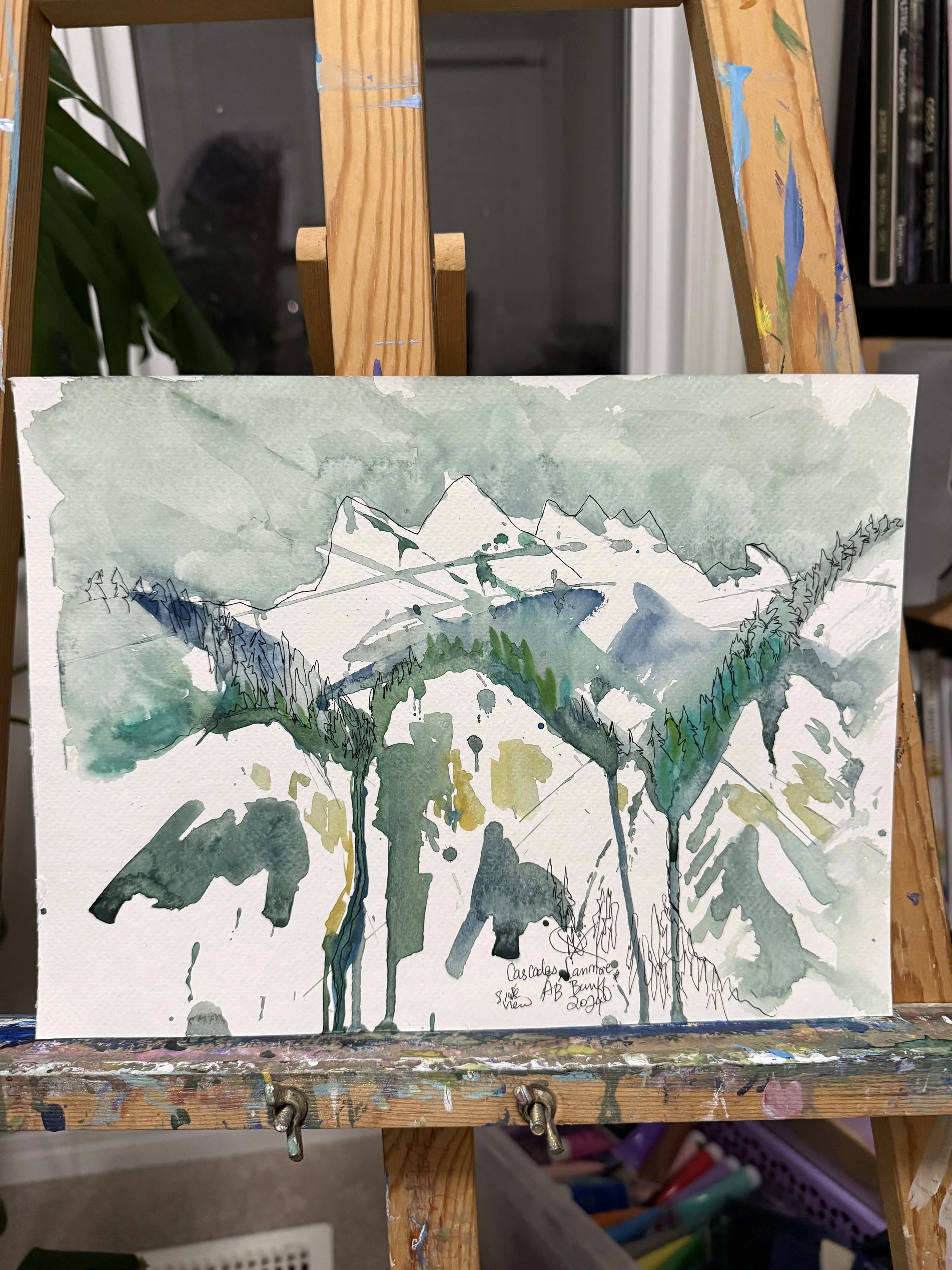 This original plein-air watercolour belongs to my 2024 Banff series — intimate field notes painted outdoors to capture the shapes of the mountains, the way light touched the land, and the proportions between rock, water, and sky. Each study helps me remember not only the atmosphere of the hike, but also the “where and how” of the landscape, should I choose to translate it later into a larger studio painting.