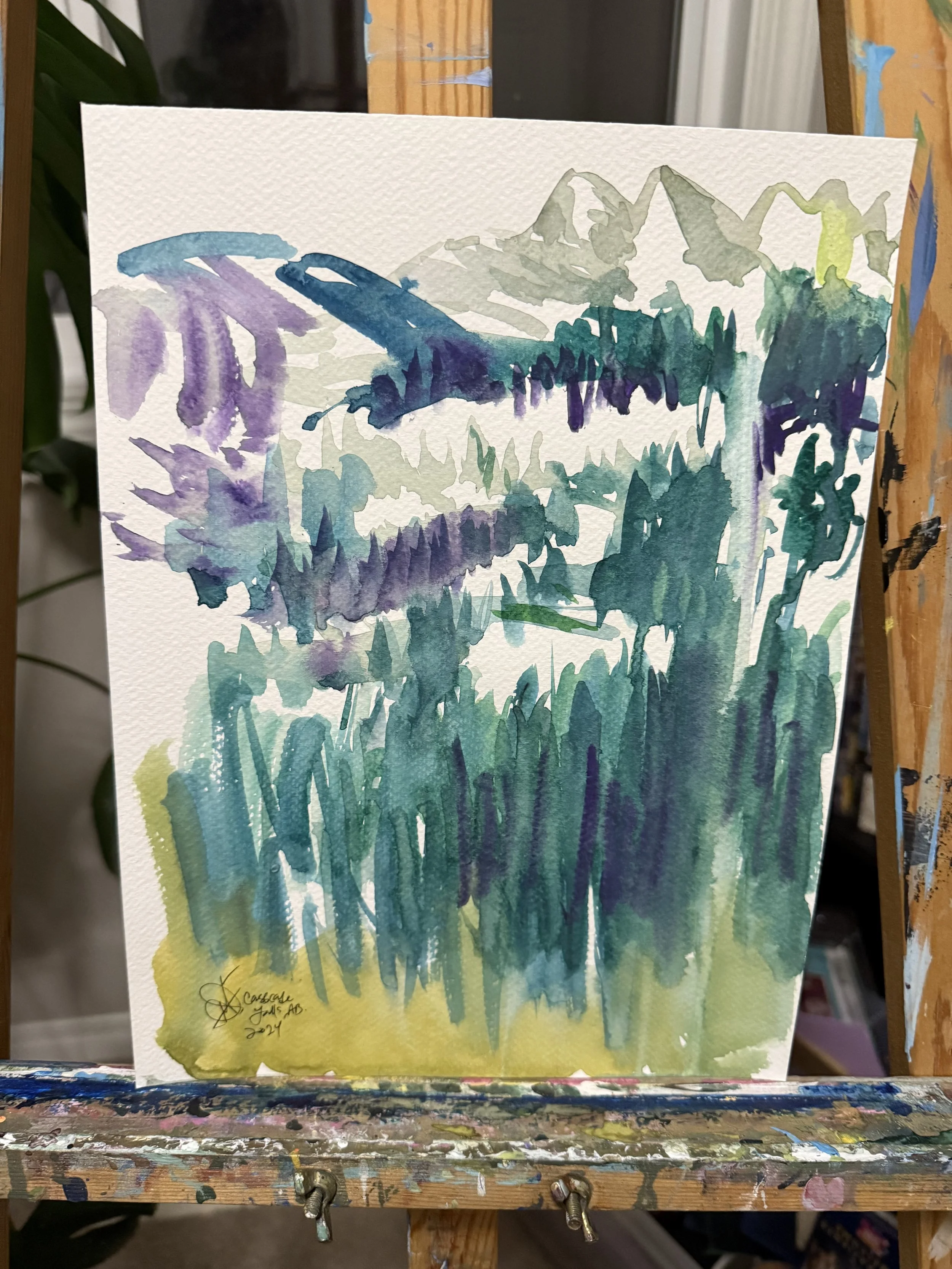 A more detailed and layered version of the Cascade falls, with focused area over the falls to the side and where the tree grew and what the tips on the mountain were shaped as. More marks, more colour, softer contrasts, and expressive green lines to track where light lands and where shadow thickens.