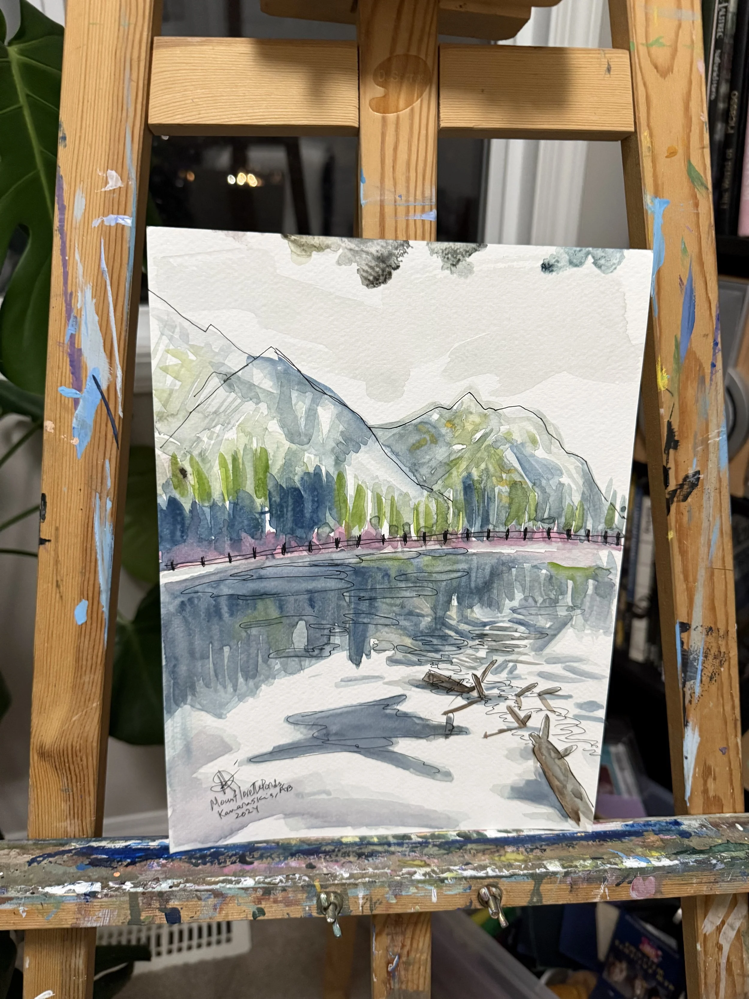 This original plein-air watercolour belongs to my 2024 Banff series — intimate field notes painted outdoors to capture the shapes of the mountains, the way light touched the land, and the proportions between rock, water, and sky. Each study helps me remember not only the atmosphere of the hike, but also the “where and how” of the landscape, should I choose to translate it later into a larger studio painting.