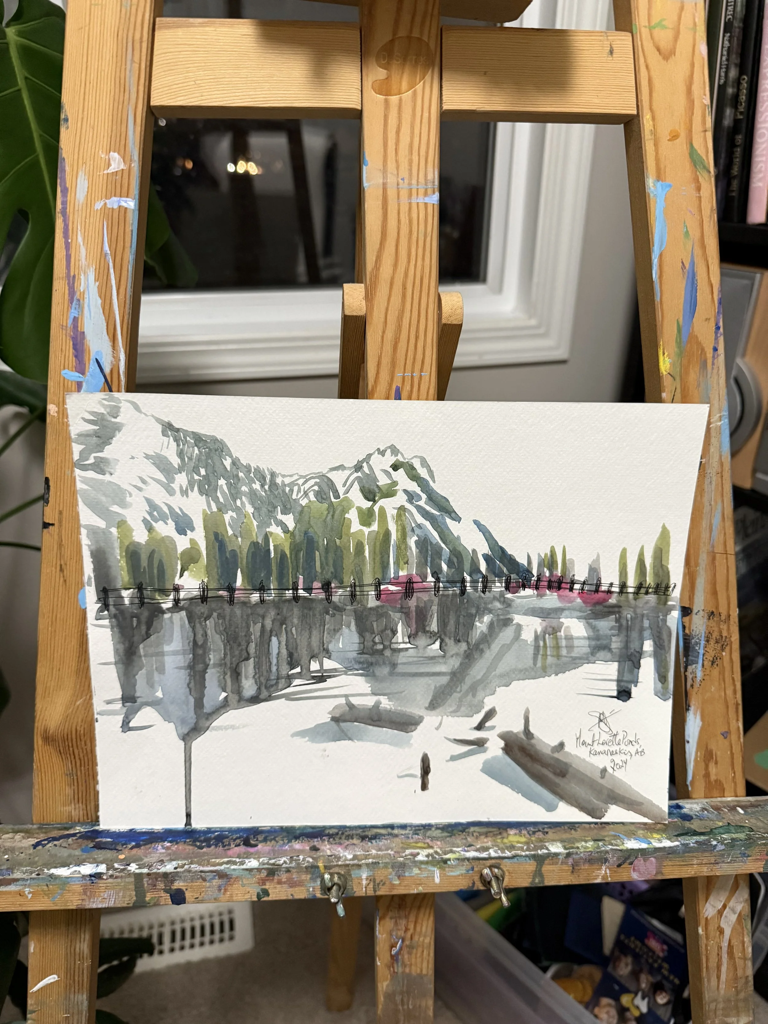 This original plein-air watercolour belongs to my 2024 Banff series — intimate field notes painted outdoors to capture the shapes of the mountains, the way light touched the land, and the proportions between rock, water, and sky. Each study helps me remember not only the atmosphere of the hike, but also the “where and how” of the landscape, should I choose to translate it later into a larger studio painting.